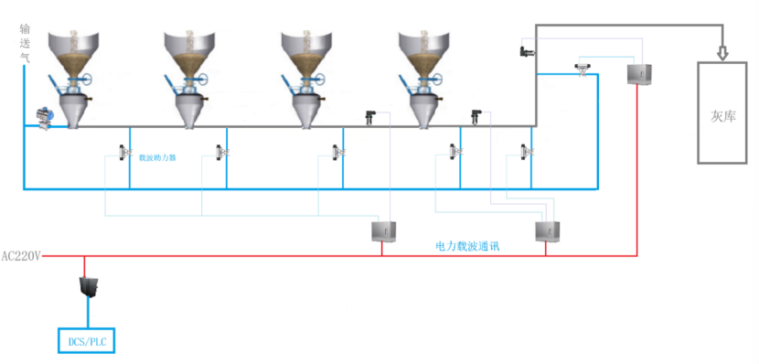 在输送管道沿途布置载波助力器(流化气),实现气力输送全程流化,保证输送系统稳定运行。载波助力器不但可以保证输送系统出力,而且可以按需分配压缩空气,节省压缩空气用量,实现输送系统低能耗运行。